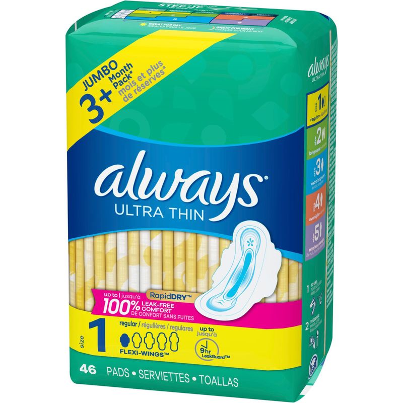 Stay comfortable and confident with Always Ultra Thin Pads Size 1 Regular Absorbency Unscented with Wings. With RapidDRY technology, these pads absorb 40% faster than the leading generic brand, keeping you clean and dry. Always MyFit sizing system helps you find the perfect fit for your flow and panty size, providing up to 20% more coverage for maximum protection.