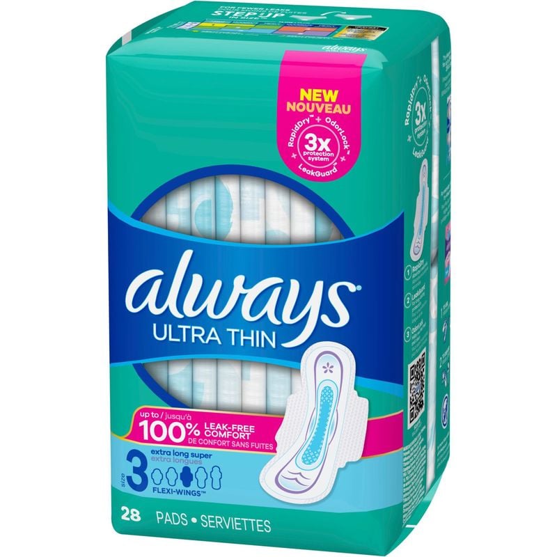 Experience up to 100% leak-free comfort all night with Always Ultra Thin Pads. Our completely reinvented pads feature advanced 3X Protection System and RapidDRY technology that absorbs three times faster than the leading store brand. With a 2x larger back, our Extra Long Super Size 3 Pads Unscented with Wings provide maximum protection no matter how you sleep.