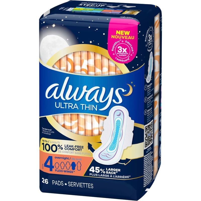 Introducing the completely reinvented Always Ultra Thin Pads Size 4 Overnight Absorbency Unscented with Wings, now with up to 100% leak-free comfort. These pads feature advanced 3X Protection System, RapidDRY, LeakGUARD core, and OdorLOCK to give you a worry-free night’s sleep. The pads are designed to absorb three times faster than the leading store brand, and the LeakGUARD core locks in leaks for long-lasting protection. With OdorLOCK, you’ll feel fresh and clean throughout the night. Plus, the 2x larger back ensures protection no matter how you sleep.