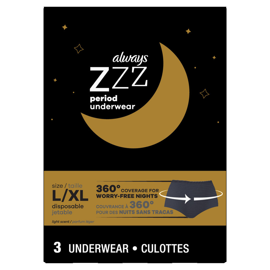 Dreaming about a worry-free nights sleep but thoughts of leaks keeping you up? discover always zzz overnight disposable period underwear size l, with 360 degree coverage for worry-free nights, no matter how you sleep. Forget about extra pads, tampons or covering your bed with towels always zzz absorbs as much as five always ultra pads, so theres no backup required. Don’t worry about how you sleep as the period underwear stays in place thanks to the panty-like fit. The silky soft and breathable material makes you feel like you’re wearing regular underwear. Catch some zs with always zzz overnight period underwear.features: leak-free period nights are possible with always zzz overnight disposable period underwear size lfeatures 360 degree coverage for worry-free nightsno backup required absorbs as much as five always ultra thin padsfits and feels like regular underwear made with silky soft and breathable materialingredients: polypropylene, sodium polyacrylate, cellulose, hot melt adhesive/adhsif thermofusible, polyester, spandex, polyethylene, black 2, styrene-butadiene copolymer/copolymre de styrene et de butadine, fragrance, titanium dioxide, peg-6 dilaurate, peg-10 hydrogenated castor oil, peg-5 castor oil, ditallowethyl hydroxyethylmonium methosulfate, peg-5 hydrogenated castor oilcaution: like most articles of clothing, underwear can burn if exposed to flame or other source of ignition.