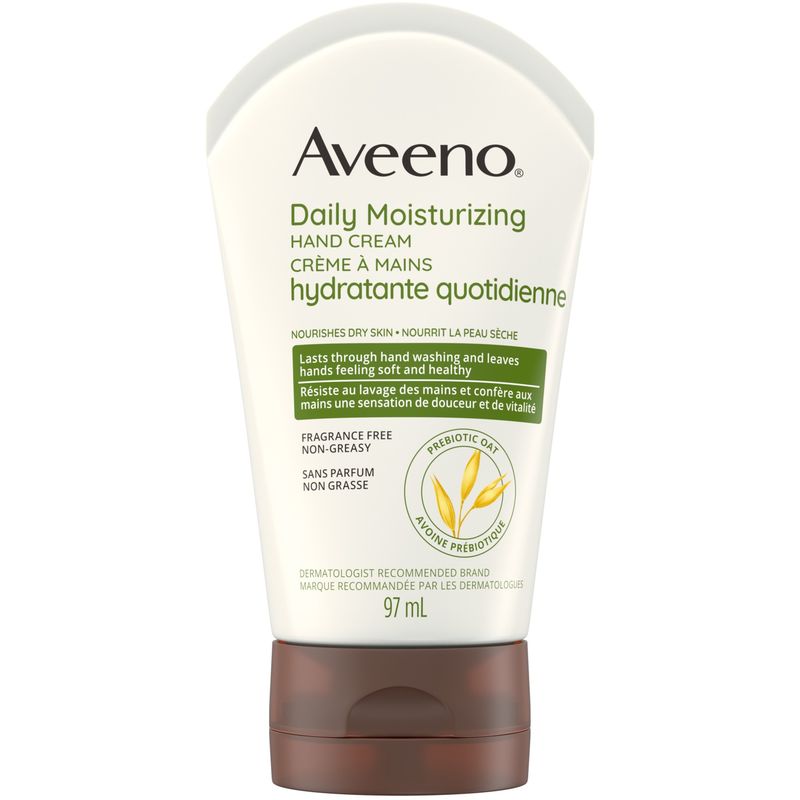 Get relief from dry hands with Aveeno Daily Moisturizing Hand Cream. This fragrance-free lotion contains a non-GMO prebiotic oat and emollients formula that soothes and moisturizes rough, cracked skin. Gentle on sensitive skin, this fast-absorbing, non-greasy hand cream forms a protective barrier against the elements and hand washing to provide relief from dryness.