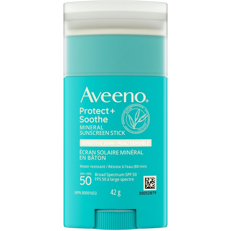Protect your sensitive skin with Aveeno Protect + Soothe Mineral Sunscreen Stick SPF 50. This travel-sized stick is perfect for on-the-go sun protection and is formulated with pure oat essence and zinc oxide, providing broad-spectrum UVA and UVB protection against harmful rays.