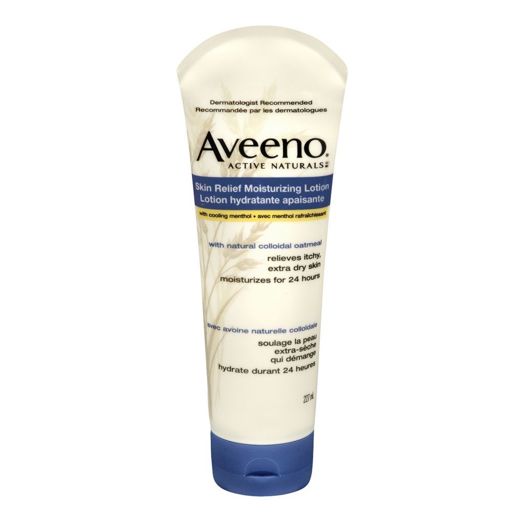 Aveeno skin relief moisturizing lotion helps you live in your most comfortable skin. This formula is clinically proven to moisturize dry skin for a full 24 hours and soothes and relieves itch and dryness. It combines active naturals colloidal oatmeal with shea butter to nourish skin and cooling menthol soothes your dry skin. Aveeno skin relief moisturizing lotion has a fresh, light scent and is non-comedogenic, so it won’t clog pores.features:227 ml tube or 354 bottle of lotion starts working immediately to soothe dry, itchy skin contains active naturals colloidal oatmeal plus rich emollients menthol cools and soothes skin clinically proven to moisturize for 24 hours dermatologist-recommended light scent non-comedogenicdirections: adults and children two years of age and older: apply to affected area not more than three to four times daily. Children under two years of age: do not use, consult a doctor.warning: for external use only. Avoid contact with eyes. Keep out of reach of children. In case of accidental ingestion, seek professional assistance.ingredients: water (eau), glycerin, distearyldimonium chloride, petrolatum, isopropyl palmitate, cetyl alcohol, dimethicone, avena sativa (oat) kernel flour, benzyl alcohol, allantoin, triticum vulgare (wheat) germ protein, menthol, sodium chloride.