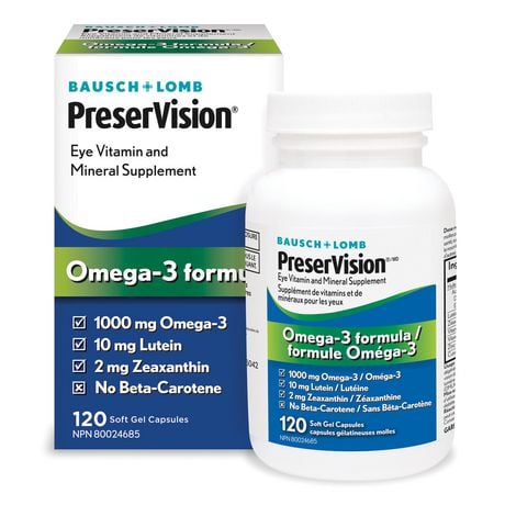 Bausch & lomb preservision omega 3 formula includes 1,000 mg omega-3 fatty acids, so that patients may not need to purchase a separate fish oil supplement or take extra fish oil pills.bausch & lomb preservision omega 3 formula is based on the original bausch + lomb preservision eye vitamin areds formula, and is a high potency antioxidant supplement with select vitamins and minerals, at levels well above those in ordinary multivitamins and generally not attainable through diet alone.based on the latest research in eye vitamin supplementation.more than 100% of the u.s. Daily values for vitamins c and ehigh levels of omega-3 fatty acids, lutein and zinc (zinc oxide)directions: take 4 soft gels per day, 2 in the morning, 2 in the evening with a full glass of water and during a meal.