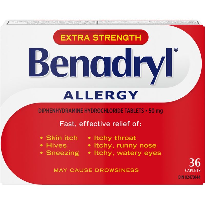 Get fast relief from tough allergy symptoms with Benadryl Extra Strength Allergy Medicine. Each caplet contains an extra strength dose of Diphenhydramine Hydrochloride (Antihistamine), 50 mg, to help relieve skin itching, hives, sneezing, itchy throat, itchy nose, runny nose, itchy eyes, and watery eyes.