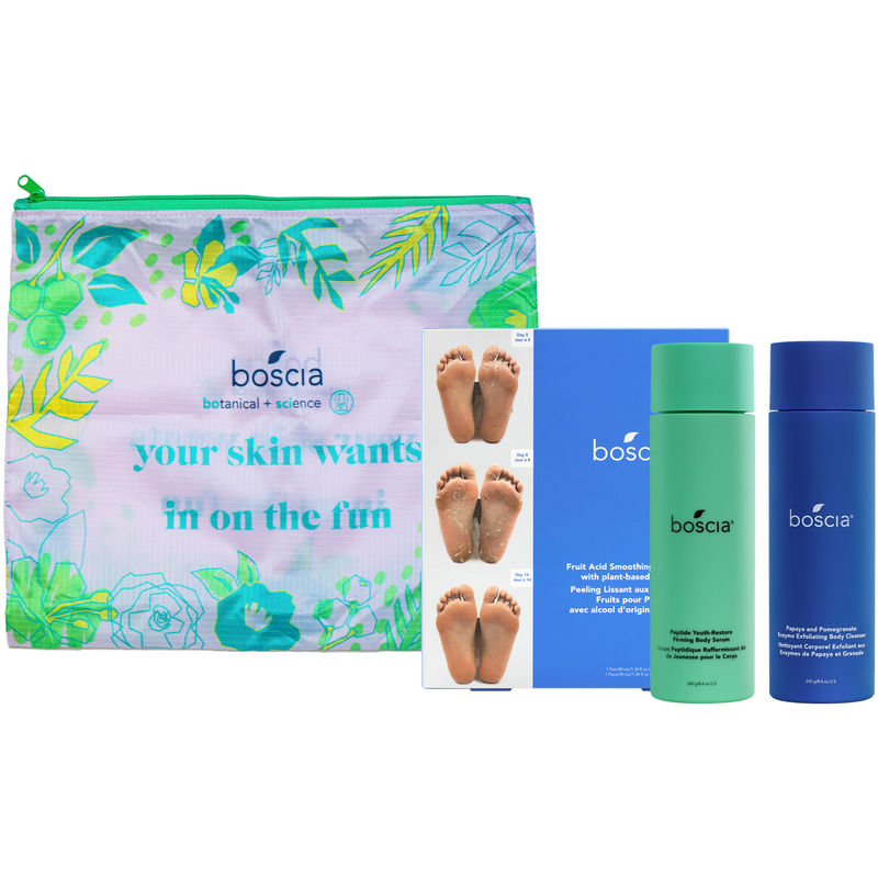 For the Papaya and Pomegranate Enzyme Exfoliating Body Cleanser, apply to wet skin and massage gently in circular motions. Rinse thoroughly with warm water. For the Peptide Youth-Restore Firming Body Serum, apply to clean, dry skin and massage in until fully absorbed. For the Fruit Acid Smoothing Foot Peel, apply a generous amount to clean, dry feet and let sit for 60-90 minutes. Rinse thoroughly with warm water.