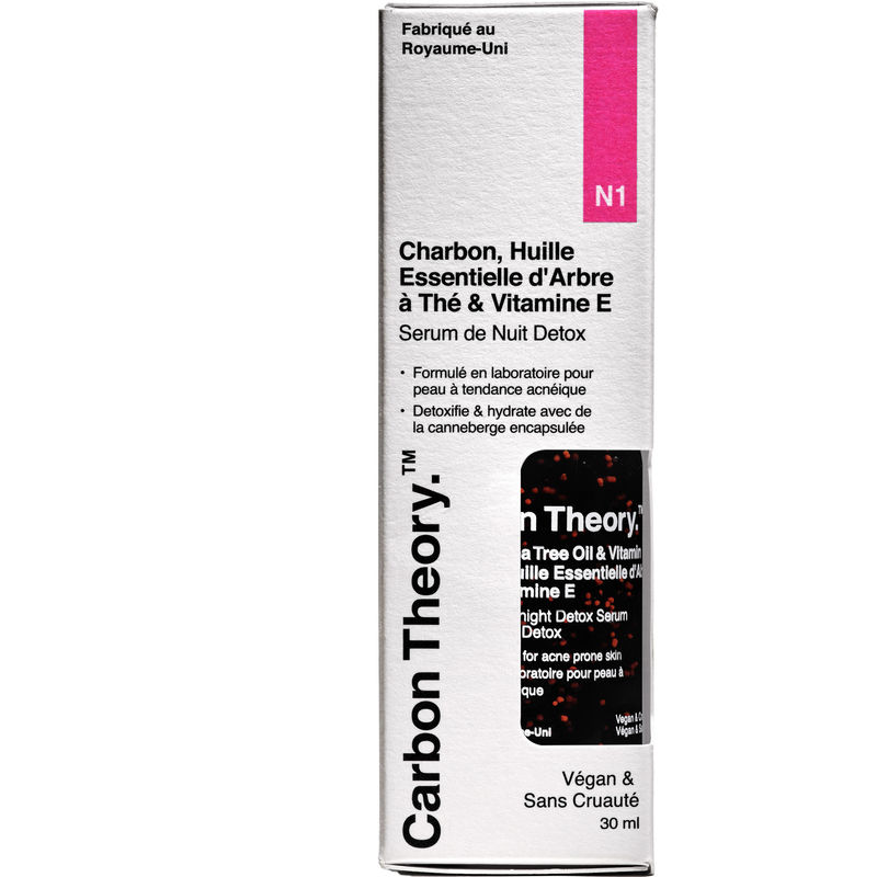 Carbon Theory Charcoal, Tea Tree Oil & Vitamin E Overnight Detox Serum is a vegan and cruelty-free intensive hydrating serum for acne-prone skin. The serum is formulated with organic activated charcoal that draws out impurities and excess oil, leaving the skin visibly healthier and purified. The organic tea tree oil in the serum provides a barrier against environmental pollution, while the Vitamin E revitalizes and nourishes the skin.