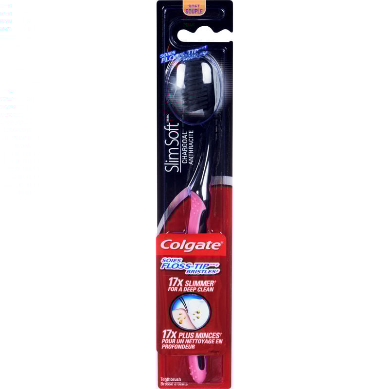 Upgrade your oral care routine with Colgate Slim Soft Charcoal Toothbrush. Its slim tip bristles, 17 times slimmer than end rounded bristles, are specially designed to clean deep in between teeth and sweep away food and plaque from around the gum line. The toothbrush comes with soft bristles and is infused with charcoal for a deep and gentle clean.