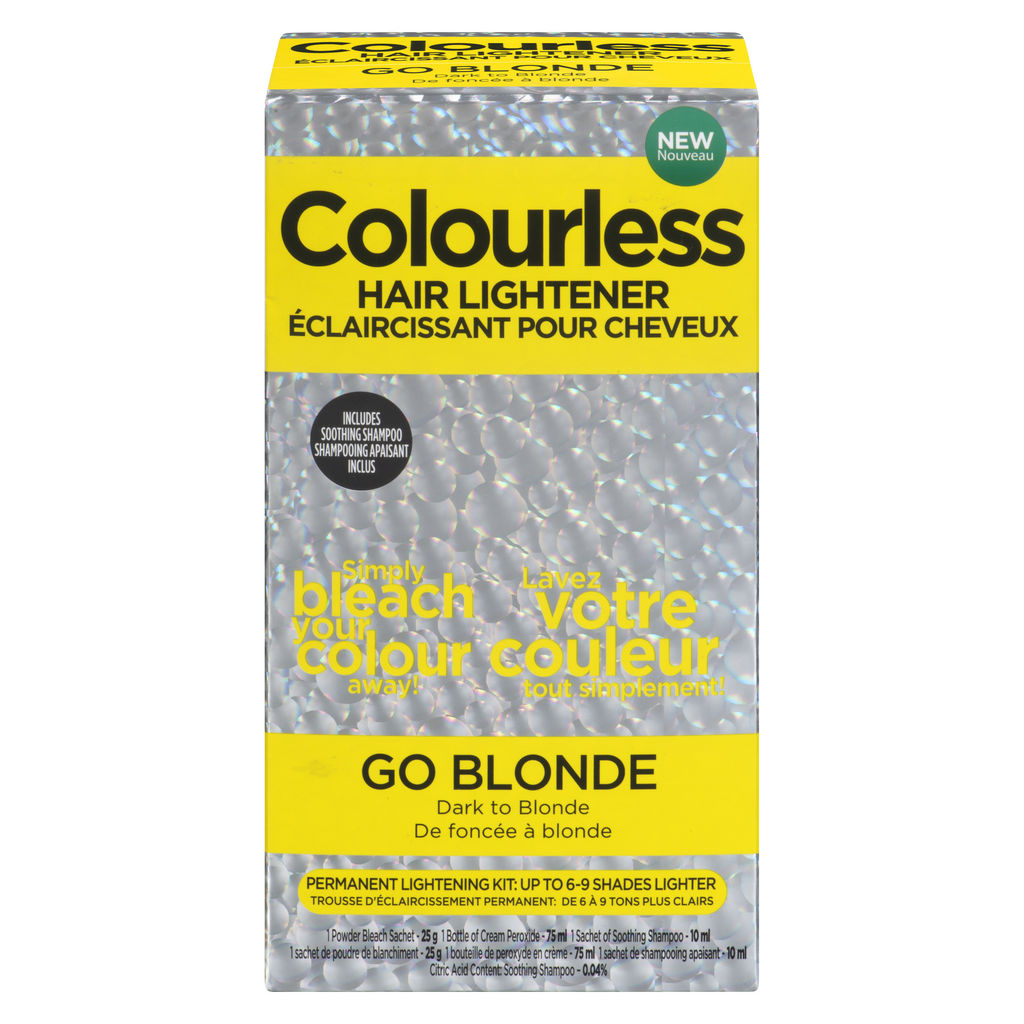 Colourless hair lightener allows you to go from dark to blonde in one single treatment. Colourless hair lightener contains a soothing shampoo to ensure your hair is soft and manageable. Colourless hair lightener is the simple way to bleach away your unwanted colour and allow you to be the colour you desire. You can safely recolour immediately after use.box contents:1 powder bleach sachet 25g1 bottle of cream peroxide 75 ml 1 sachet of soothing shampoo 10 ml1 instructions1 brush1 gloves1 mixing bath1 processing capfeatures:includes soothing shampoosimply bleach your colour away!permanent lightening kit: up to 6-9 shades lightercitric acid content: soothing shampoo – 0.04%contains one applicationdirections: see kit instructions. Not suitable for henna treated or afro textured hair use two packs for hair longer shoulder lengthingredients: cream peroxide: aqua, hydrogen peroxide, cetyl alcohol, cetearyl alcohol, peg-20 stearate, vitis vinifera, stearyl alcohol, disodium edta, phosphoric acid, tetrasodium pyrophosphatepowder bleach: potassium persulfate, ammonium persulfate, sodium silicate, magnesium carbonate hydroxide, sodium metasilicate, sodium stearate, cyamopsis tetragonoloba gum, kaolin, magnesium oxide, cyclodextrin, disodium lauryl sulfosuccinate, paraffinum liquidum, xanthan gum, disodium edta, ci 77007 soothing shampoo: aqua, cocamidopropyl betaine, sodium laureth sulfate, sodium chloride, vitis vinifera, hydroxypropyl guar hydroxypropyltrimonium chloride, polysorbate 20, benzyl alcohol, parfum, glycol distearate, dimethiconal, silicone quaternium-22, laureth-4, tocopherol, hydroxypropyltrimonium hydrolyzed wheat protein, ppg-3 myristyl ether, niacinamide, butylene glycol, sodium starch octenylsuccinate, sodium hydroxide, disodium edta, calcium pantothenate, maltodextrin, dehydroacetic acid, hexyl cinnamal, buteth-3, keratin, helianthus annuus, benzyl salicylate, citric acid, tea-dodecylbenzenesulfonate, sodium benzotriazolyl butylphenol sulfonate, hydrolyzed keratin, sodium ascorbyl phosphate, alpha-isomethyl ionone, hydroxyisohexyl 3-cyclohexene carboxaldehyde, tocopheryl acetate, pyridoxine hcl, geraniol, phenoxyethanol, formic acid, aloe barbadensis, sodium benzoate, silica, tributyl citratewarning: contains bleach. It is important to read the instructions before use.
