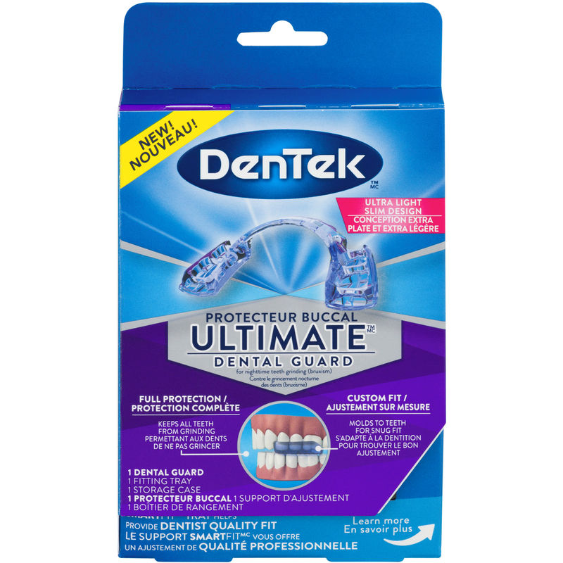 Protect your teeth from nighttime grinding with the DenTek Ultimate Dental Guard. This ultra-light, slim guard is designed for ultimate comfort and protection. With cushioned bite pads that mold to the shape of your teeth, you’ll get a secure, snug fit that keeps your front and back teeth from touching for complete protection. The SmartFit tray flexes to accommodate different mouth sizes and teeth formations, ensuring a dentist-quality fit. The easybreathe flex band fits behind the front teeth for open air flow while sleeping. All parts and accessories are BPA-free and come with a mouth guard storage case.