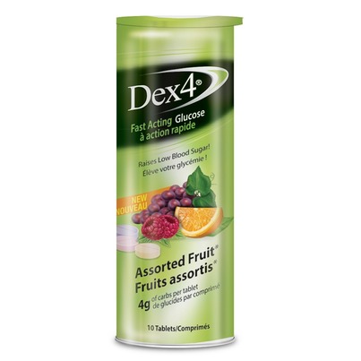 Each dex4 glucose tablet contains 4g of fast-acting carbohydrates. Dex4 glucose tablets raise your blood sugar fast! great for mild and moderate episodes of hypoglycemia.features:dex4 glucose tablets come in easy opening, crush-proof, travel tubes of 10 tablets, with a re-sealable snap-cap, so you can take them anywhere!reduce the risk of over treatment with quick dissolving dex4 tablets. Because they provide precisely 4 grams of fast-acting carbohydrates its easier to calculate what you need with no unnecessary calories4 tabs for 16g of fast-acting carbsingredients: orange: dextrose (d-glucose), maltodextrin, citric acid, magnesium stearate, microcrystalline cellulose, natural & artificial orange flavour, ascorbic acid, yellow #6. Grape: dextrose (d-glucose), maltodextrin, microcrystalline cellulose, citric acid, magnesium stearate, natural & artificial grape flavour, ascorbic acid, fd&c red #40, fd&c blue #2. Raspberry: dextrose (d-glucose), maltodextrin, microcrystalline cellulose, citric acid, magnesium stearate, natural & artificial raspberry flavour, ascorbic acid, fd&c red #40.