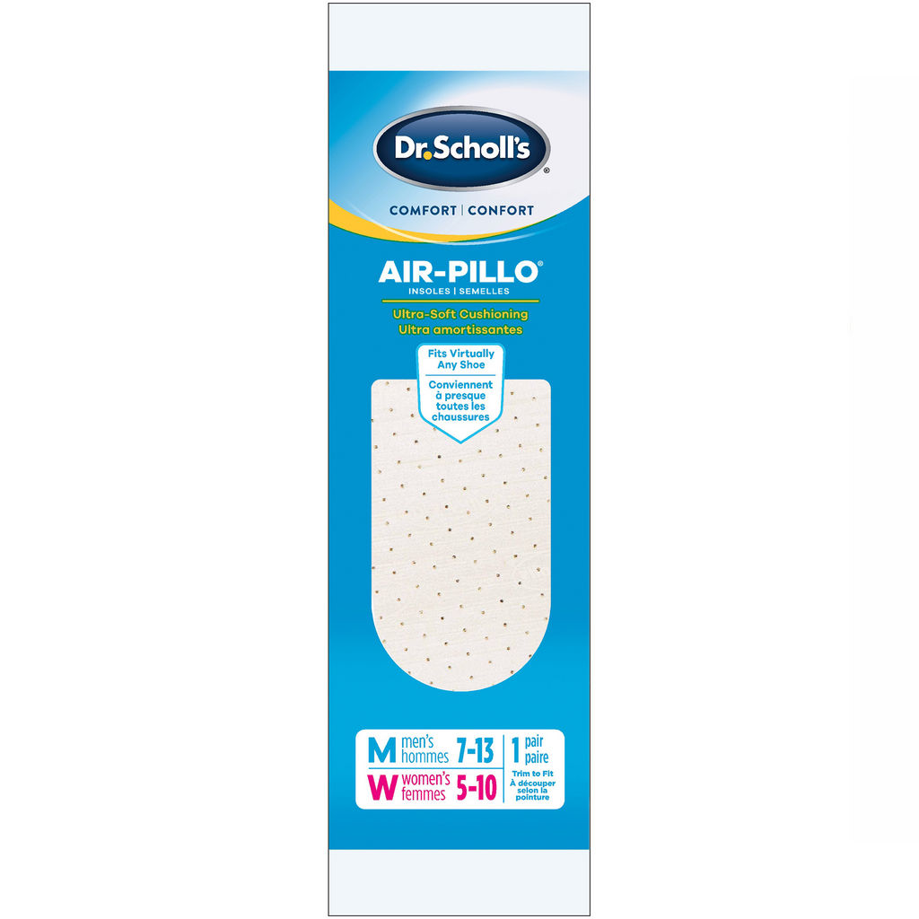 Dr. Scholl’s comfort air-pillo original insoles have a double layer system which includes a top layer of soft cushioning foam that provides long-lasting comfort and a bottom layer of shock absorbing foam that bounces back time after time. Top cloth contains an antimicrobial agent that kills odour-causing fungus and bacteria. Designed for less wrinkling, bunching and slipping, to provide a comfortable shoe fit. Contains natural rubber (latex). Trim to fit. Men’s sizes 7-13, women’s sizes 5-10.