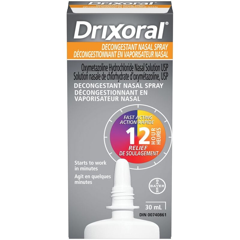 Breathe easy with Drixoral Decongestant Nasal Spray. This fast-acting and long-lasting nasal spray provides 12 hours of relief from nasal and sinus congestion due to colds, allergies, and hay fever. It comes in a quick and easy to use squeezable bottle, making it convenient for on-the-go use.