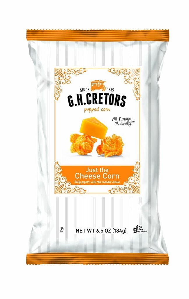 All natural. Naturally! fluffy popcorn with real cheddar cheese. Kosher / no gluten ingredients. It all began in 1885 when great grandpa cretors invented the popcorn machine and the family began perfecting the art of popping corn. His ‘modern machine’ appeared at the chicago columbian exposition in 1893, and for five generationsthey’ve followed in his corn-popping footsteps, taste-testing recipes aroundtheir kitchen table. Todayg.h. Cretorsmakestheircheese corn just like great grandpa did. They melt real cheddar cheese in special kettles to just the right temperature before pouring it on the fluffiest popcorn you’ve ever tasted. Fromtheir kitchen to yours, enjoy! no gluten ingredients. Aged cheddar cheese. Cheese corn. No artificial flavors or coloring.