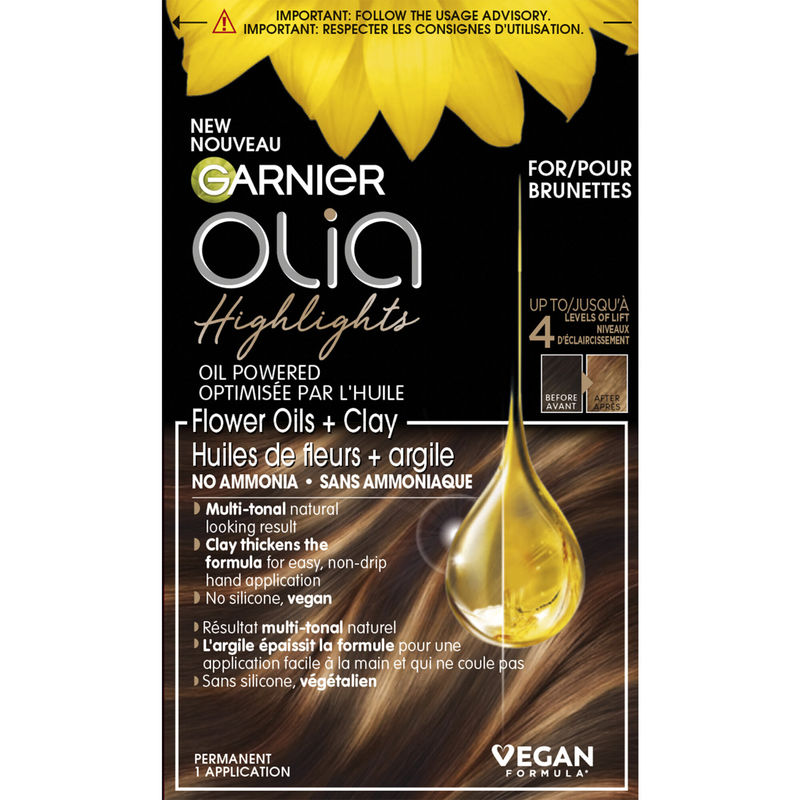 Get natural-looking hair highlights with Garnier Olia Ammonia-Free Highlights. Our new lightening formula is enriched with 60% natural flower oils and kaolin clay additive to thicken the mixture and preserve hair moisture during the application process. The Olia Highlights is ammonia-free, silicone-free and vegan, and can lighten up to 4 levels of lift for multidimensional-looking results.