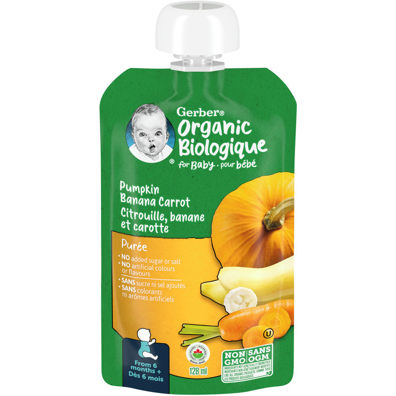 Introduce your little one to the goodness of veggies and fruits with GERBER® Organic Purée, Pumpkin Banana Carrot, Baby Food (128 ml). Made with ¼ cup pumpkin, ½ banana, and 1/5 carrot, this non-GMO baby food has no sugar or salt added, making it perfect for babies 6 months and up. Plus, the new Smart Flow™ spout helps create less mess and more nutrition during mealtime.