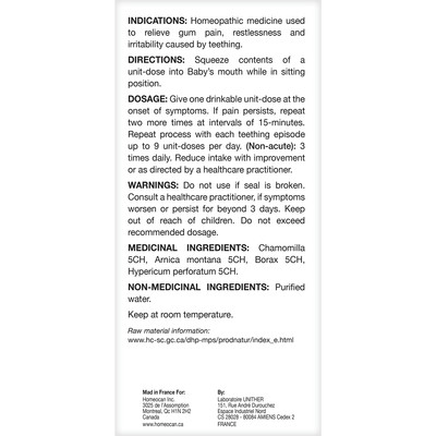 Fight effectively and naturally the symptoms that your baby’s dental flare ups with kids 0-9 teething unit-doses. Product information is provided by the product vendor. This content is a summary for informational purposes only and does not have all possible information about this product. It should not be used as a substitute for advice from health care professionals, as this information alone does not assure that this product is safe, effective, or appropriate for you. For more detailed information on this product, including reported and possible side effects and contraindications, refer to the manufacturer’s monograph, or speak with a health care provider.