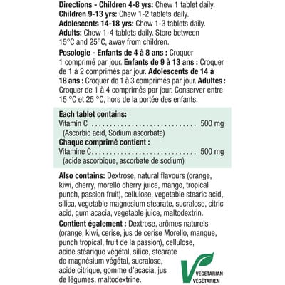 Chewable vitamin c 500 mg mixed fruit is a powerful antioxidant. It offers a variety of benefits from boosting the immune system to promoting healthy capillaries, teeth and gums, and aiding in iron absorption. Product information is provided by the product vendor. This content is a summary for informational purposes only and does not have all possible information about this product. It should not be used as a substitute for advice from health care professionals, as this information alone does not assure that this product is safe, effective, or appropriate for you. For more detailed information on this product, including reported and possible side effects and contraindications, refer to the manufacturer’s monograph, or speak with a health care provider.