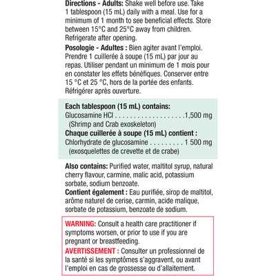 Liquid glucosamine 1,500 mg is a great-tasting wild cherry flavoured formula that provides long-lasting pain relief and helps with the maintenance of joint and catilage health. Product information is provided by the product vendor. This content is a summary for informational purposes only and does not have all possible information about this product. It should not be used as a substitute for advice from health care professionals, as this information alone does not assure that this product is safe, effective, or appropriate for you. For more detailed information on this product, including reported and possible side effects and contraindications, refer to the manufacturer’s monograph, or speak with a health care provider.