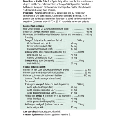 Omega 3-6-9 provides omega-3, 6 and 9. These essential fatty acids are naturally and sustainably sourced from fish and cold-pressed, organic flax oils. Omega 3-6-9 promotes the maintenance of healthy heart and cognitive function. Product information is provided by the product vendor. This content is a summary for informational purposes only and does not have all possible information about this product. It should not be used as a substitute for advice from health care professionals, as this information alone does not assure that this product is safe, effective, or appropriate for you. For more detailed information on this product, including reported and possible side effects and contraindications, refer to the manufacturer’s monograph, or speak with a health care provider.