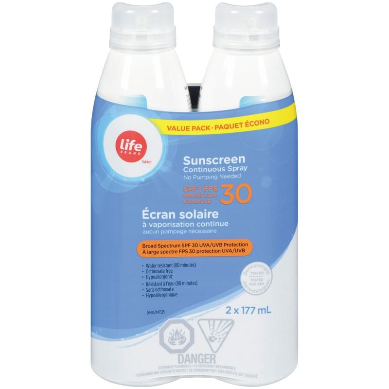 Shield your skin from harmful UV rays with Life Brand LB Sunscreen Continuous Spray SPF30 Value Pack. This pack includes two 177 mL bottles of water-resistant sunscreen, perfect for on-the-go protection. The sunscreen is oxybenzone-free, hypoallergenic, and dermatologist-tested, making it safe for adults and children over 6 months of age.