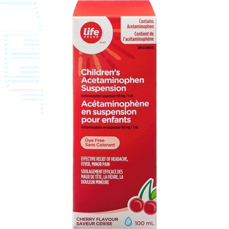 Life Brand Children’s Acetaminophen Suspension is a cherry-flavored suspension that contains 160 mg of acetaminophen per 5 mL. It is suitable for children aged 2 to 11 and is used to reduce fever and temporarily relieve mild to moderate aches and pain due to headache, toothache/teething pain, common cold and flu, and immunization.