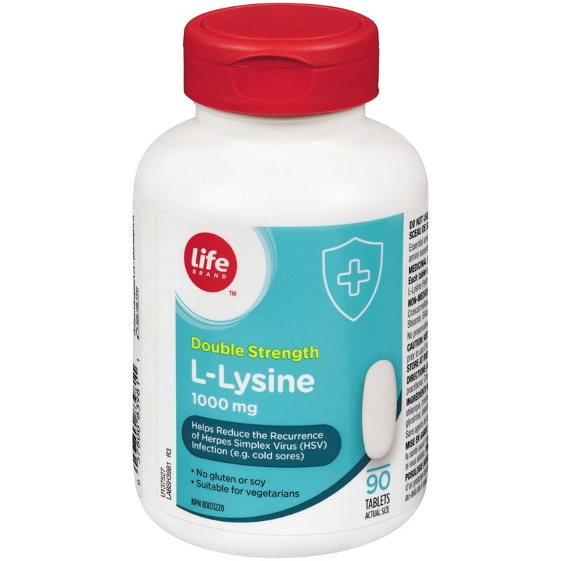 Life Brand L-Lysine Double Strength Tablets are an essential amino acid supplement that helps reduce the recurrence of herpes simplex virus (HSV) infection, such as cold sores. These tablets are suitable for vegetarians and contain no gluten, lactose, or soy. Each tablet contains 1000mg of L-Lysine (Hydrochloride), which helps in collagen formation and the maintenance of good health.