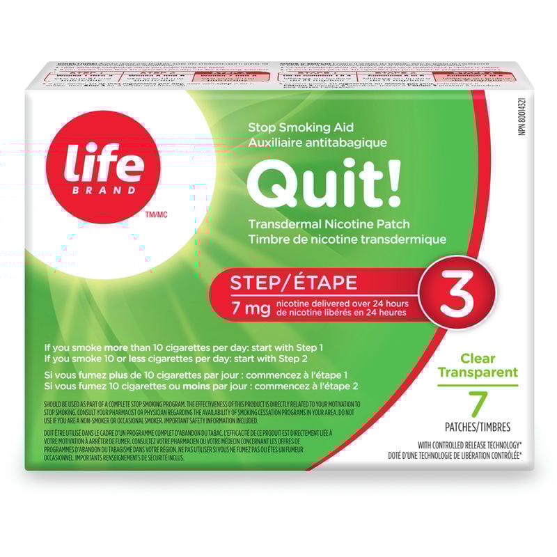 Quit smoking with Life Brand LB Nicotine Patch 7mg Stop 3 Clear 7 Count. This stop smoking aid is designed to deliver nicotine over 24 hours with controlled release technology. The clear square patch is easy to apply and can help you stop smoking completely when used as directed.