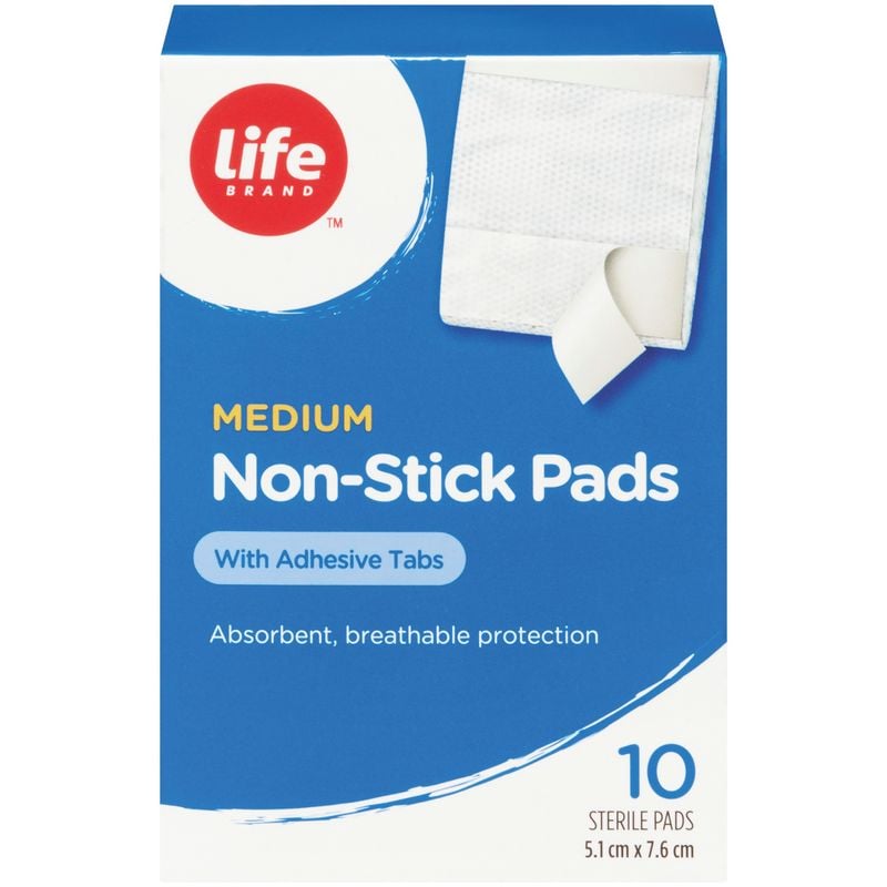 The Life Brand LB Sterile Nonstick Pads with Adhesive Tabs are made with a nonstick outer layer and adhesive tabs.