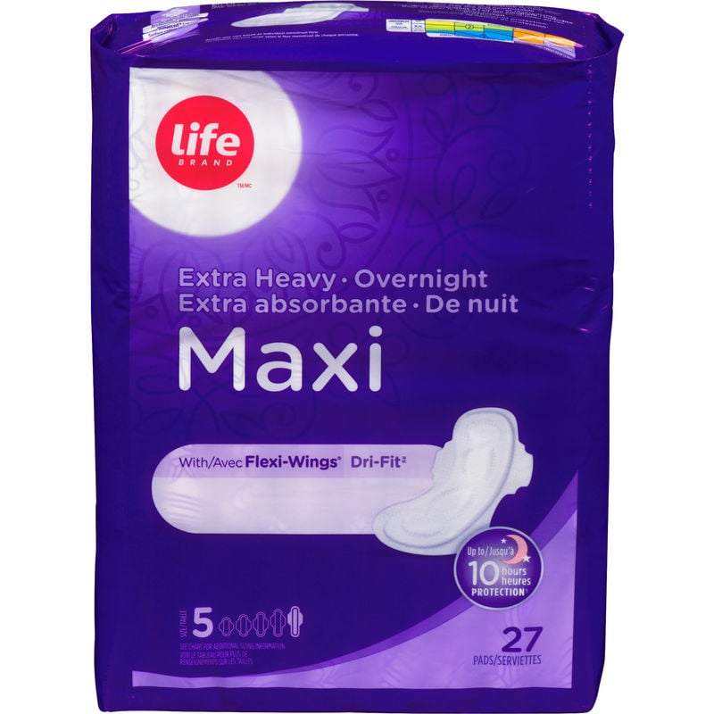 Using Life Brand Life Maxi Overnight Extra Heavy Flow with Flexi-Wings® is easy. Simply open the pouch, remove the pad, and press it into your underwear. Keep the pouch for disposal. Then, peel the paper tabs from the Flexi-Wings®, wrap the wings around the sides of your underwear, and attach by pressing the underside of your underwear.