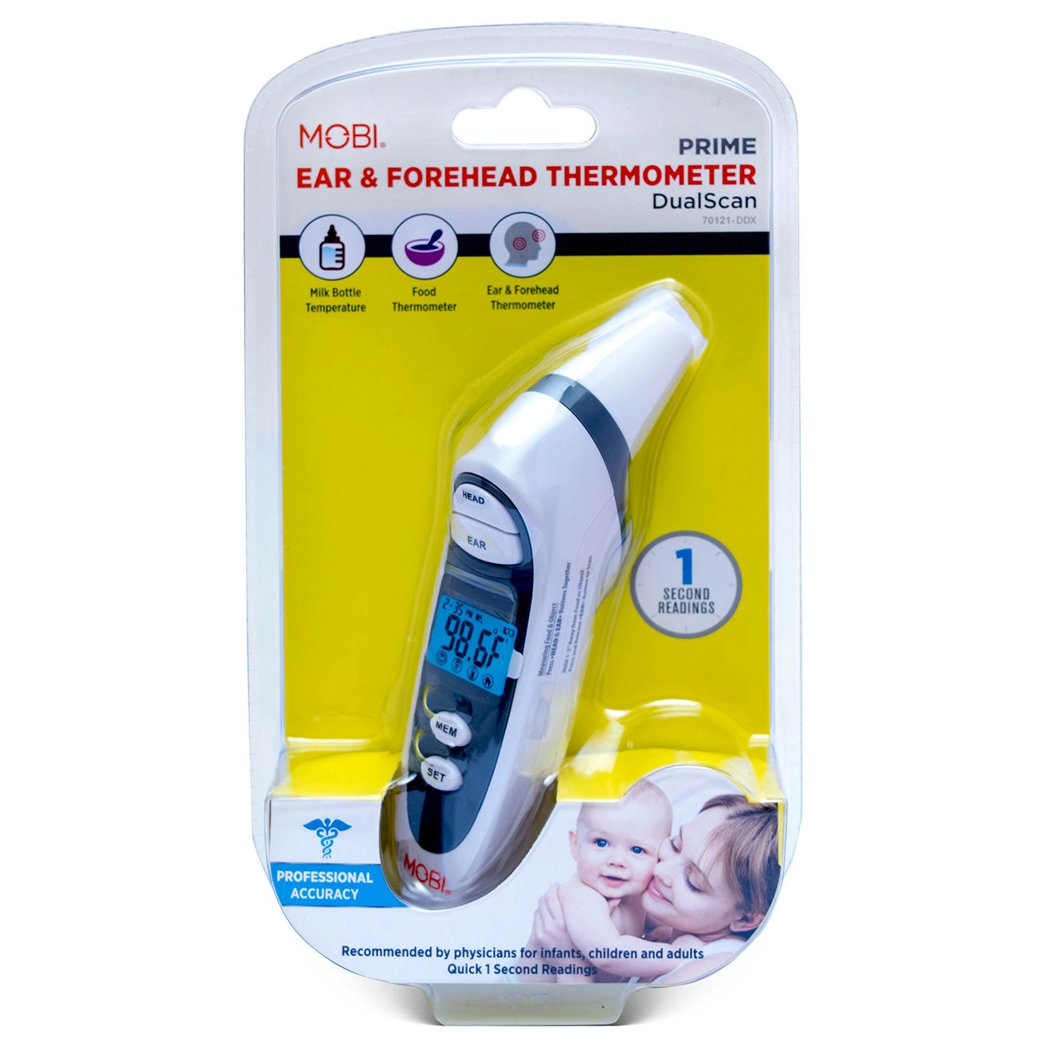 Introducing the MOBI DualScan Prime Ear & Forehead Thermometer – the ultimate thermometer for all ages. With its professional accuracy, this thermometer is recommended by physicians for infants, children, and adults. It provides quick 1-second readings, making temperature measurement a breeze.