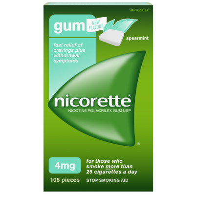 Nicorette gum, with 4mg of nicotine, spearmint, 105 pieces works fast to relieve your cravings plus withdrawal symptoms to help you quit smoking. Containing 4 milligrams of nicotine per piece, this gum helps fight the craving to smoke and helps reduce unpleasant withdrawal symptoms. Using nicorette gum correctly can help double your chances of quitting versus willpower alone. Chew a piece of this nicorette gum whenever you feel the urge to smoke, up to 20 pieces a day. This nicotine gum is indicated for adults who smoke more than 25 cigarettes a day, who want to quit smoking immediately or quit gradually by reducing the amount of cigarettes they smoke each day. Feel confident in your quit attempt with this nicotine replacement therapy (nrt) and smoking cessation aid. Use this chart as a guide to help aid your quit attempt: month 1 – first 2 weeks: 10 to 20 pieces per daymonth 1 – last 2 weeks: 8 to 15 pieces per day month 2 – 4 to 10 pieces per day month 3 – 2 to 5 pieces per daymonth 4 through 6 – 1 piece if the urge to smoke returnsdirections: adult dosage (>18 yrs):important: before use, read enclosed user guide for complete instructions on the stop to quit and reduce to quit programs.chew one nicorette gum piece slowly and intermittently for 30 minutes whenever you get the desire to smoke. See the user guide for the recommended number of pieces you should use.do not exceed 20 pieces per day.consult your doctor or pharmacist if you have any questions concerning nicorette gum.ingredients: acacia, acesulfame potassium, black iron oxide, carnauba wax, d&c yellow no. 10 al-lake, flavour (contains chamomile), gum base, hypromellose, magnesium oxide, menthol, peppermint oil, polysorbate 80, sodium carbonate, sucralose, titanium dioxide, xylitolcaution: do not use if you are an occasional or non-smoker. Keep out of reach of children and pets. Do not use if the blister foil is punctured or damaged. Do not use if you: are under 18 years of age; are pregnant or nursing; have a jaw disorder; have heart arrhythmias; have had a heart attack; have angina pectoris; or are allergic to nicotine or to any of the non-medicinal ingredients in the product.ask your doctor before use if you: have/have had heart, thyroid, circulation, stomach, liver, kidney, throat or mouth problems, or high blood pressure; take insulin or any prescription medicine.for product support, call 1-866-311-5655.
