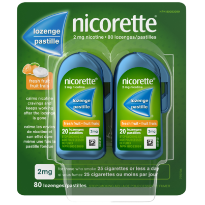 Nicorette lozenges allow you to experience all the effective craving and withdrawal relief of nicorette in a lozenge. With 2 milligrams of nicotine, each lozenge helps you fight cravings and end withdrawal symptoms to help you quit smoking. Using nicorette lozenges correctly can double your chances of quitting versus willpower alone. Place one of these nicorette mint-flavoured lozenges in your mouth whenever you feel the urge to smoke, up to 15 times a day. These lozenges are indicated for adults smoking one pack or less a day, who want to stop smoking.features:effective craving and withdrawal relief to help you quit smoking2 mg of nicotine per lozengereleases controlled amount of nicotine into your bodyfruit flavour lozengedirections: place the lozenge in your mouth and occasionally move the lozenge from one side of your mouth to the other until completely dissolved (about 10 minutes). Mize swallowing. Do not chew or swallow lozenge. Adult dosage (18 years of age and over): if you smoke your first cigarette within 30 minutes of waking up, use 4 mg nicotine lozenge. If you smoke your first cigarette more than 30 minutes after waking up use 2 mg nicotine lozenge according to the following 12-week schedule: weeks 1 to 6: one lozenge every 1 to 2 hours. Weeks 7 to 9: one lozenge every 2 to 4 hours. Weeks 10 to 12: one lozenge every 4 to 8 hours. Do not use more than 15 lozenges per day. Opening directions: 1 – push in child resistant tab on the vial with thumb. 2 – flip up the top of vial. Turn upside down and shake to remove lozenge. To be used as part of a comprehensive smoking cessation program.before use, read the user guide for complete instructions and other important information. Medicinal ingredients: each lozenge contains 2 mg of nicotine as nicotine resinate.non-medicinal ingredients: acesulfame potassium, flavours, gum acacia, hypromellose, magnesium stearate, mannitol, mica-based pearlescent pigments, microcrystalline cellulose, polysorbate 80, sodium carbonate, sucralose, titanium dioxide, xanthan gum.caution: consult your doctor before using this product if you have/have had heart, thyroid, circulation, stomach problems, high blood pressure, or if you are taking insulin or any prescription medicine. Do not smoke, chew tobacco, or use snuff or any other nicotine replacement therapy products while using nicotine lozenges. In case of overdose get medical help or contact a poison control center right away. Do not use if you are: pregnant or nursing, are under 18 years of age, are an occasional or non-smoker.keep out of reach of children and pets. Tamper evident feature: do not use if the printed seal on the vial is missing or broken. Keep the vial tightly closed and store between, 15-30c. Protect from light.should you require consultation with a pharmacist, you may contact our well.ca pharmacist. Please read the label, warnings and inserts provided by the manufacturer and consult your healthcare professional when purchasing medications or natural health products to be sure the product is right for you.