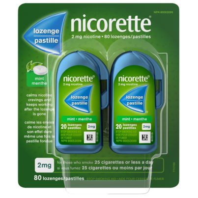 Nicorette lozenges allow you to experience all the effective craving and withdrawal relief of nicorette in a lozenge. With 2 milligrams of nicotine, each lozenge helps you fight cravings and end withdrawal symptoms to help you quit smoking. Using nicorette lozenges correctly can double your chances of quitting versus willpower alone. Place one of these nicorette mint-flavoured lozenges in your mouth whenever you feel the urge to smoke, up to 15 times a day. These lozenges are indicated for adults smoking one pack or less a day, who want to stop smoking.features:effective craving and withdrawal relief to help you quit smoking2 mg of nicotine per lozengereleases controlled amount of nicotine into your bodycooling mint flavour lozengedirections: place the lozenge in your mouth and occasionally move the lozenge from one side of your mouth to the other until completely dissolved (about 10 minutes). Mize swallowing. Do not chew or swallow lozenge. Adult dosage (18 years of age and over): if you smoke your first cigarette within 30 minutes of waking up, use 4 mg nicotine lozenge. If you smoke your first cigarette more than 30 minutes after waking up use 2 mg nicotine lozenge according to the following 12-week schedule: weeks 1 to 6: one lozenge every 1 to 2 hours. Weeks 7 to 9: one lozenge every 2 to 4 hours. Weeks 10 to 12: one lozenge every 4 to 8 hours. Do not use more than 15 lozenges per day. Opening directions: 1 – push in child resistant tab on the vial with thumb. 2 – flip up the top of vial. Turn upside down and shake to remove lozenge. To be used as part of a comprehensive smoking cessation program.before use, read the user guide for complete instructions and other important information. Medicinal ingredients: 2 mg of nicotine as nicotine polacrilex. Non-medicinal ingredients: acesulfame potassium, calcium polycarbophil, flavours, magnesium stearate, mannitol, potassium bicarbonate, sodium alginate, sodium carbonate, xanthan gum.caution: consult your doctor before using this product if you have/have had heart, thyroid, circulation, stomach problems, high blood pressure, or if you are taking insulin or any prescription medicine. Do not smoke, chew tobacco, or use snuff or any other nicotine replacement therapy products while using nicotine lozenges. In case of overdose get medical help or contact a poison control center right away. Do not use if you are: pregnant or nursing, are under 18 years of age, are an occasional or non-smoker.keep out of reach of children and pets. Tamper evident feature: do not use if the printed seal on the vial is missing or broken. Keep the vial tightly closed and store between, 15-30c. Protect from light.should you require consultation with a pharmacist, you may contact our well.ca pharmacist. Please read the label, warnings and inserts provided by the manufacturer and consult your healthcare professional when purchasing medications or natural health products to be sure the product is right for you.