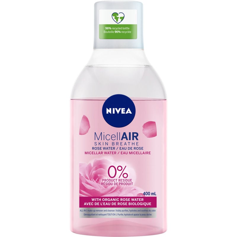Get visibly purified, hydrated, and glowing skin with Nivea MicellAIR Rose Water Micellar Water. This dermatologically tested micellar water is an all-in-1 make-up remover and cleanser that leaves behind 0% product residue, so your skin can breathe. Made with organic rose water, it soothes dry skin and removes waterproof make-up without rubbing or rinsing. Suitable for all skin types, the bottle is made from 96% recycled material, making it kind to your skin and the planet!