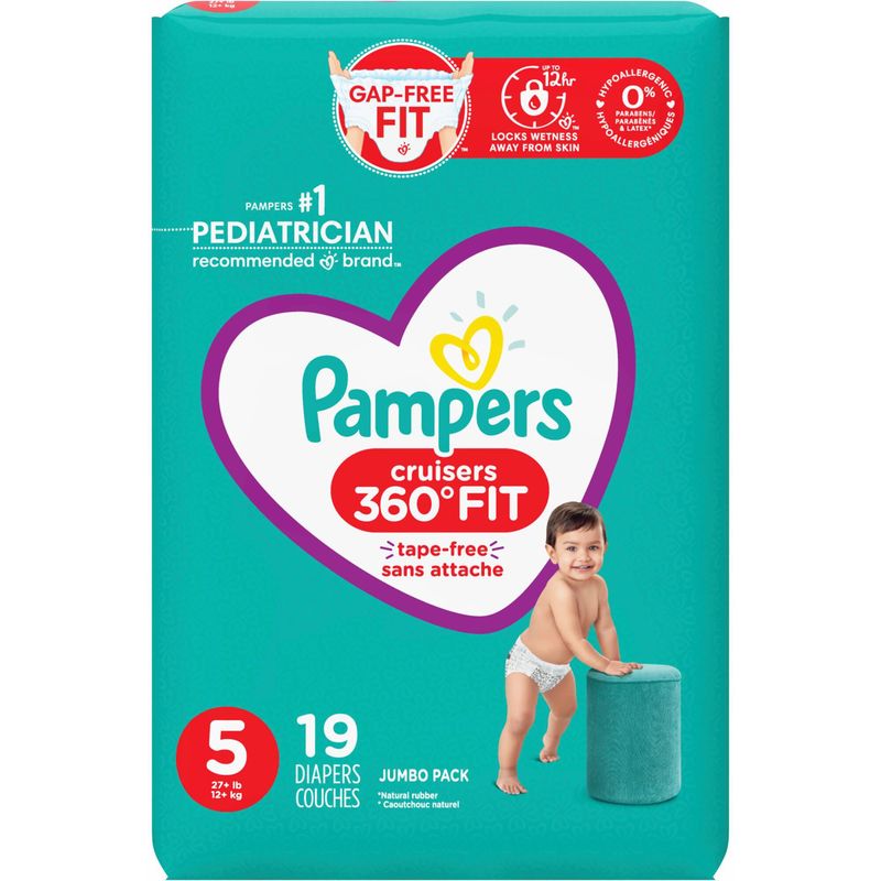 Pampers Cruisers 360 Diapers Jumbo Pack Size 5, 19 Count is the perfect solution for parents looking for the best fit and protection for their active baby. Our 360 stretchy waistband ensures a gap-free fit, while the LockAway Channels lock wetness away from your baby’s skin for up to 12 hours.