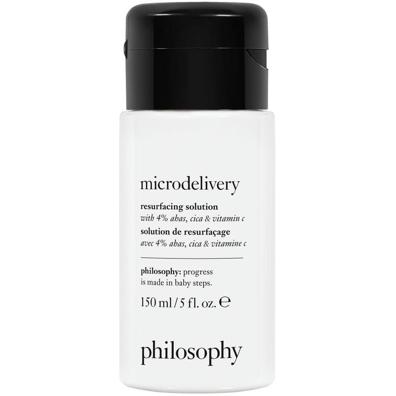 Get ready to reveal baby soft skin with Philosophy’s Microdelivery Resurfacing Solution. This daily liquid exfoliator is packed with the ideal balance of 4% AHAs, responsibly sourced cica, vitamin C, niacinamide, peptides, and hyaluronic acid for a non-stripping, gentle formula that instantly replenishes and resurfaces skin in one sweep. Say goodbye to pores and uneven skin tone while increasing hydration for bright, even, and glowing skin. Clinically proven for +38% instant and long-lasting hydration, this liquid exfoliant is perfect for revealing your best skin yet.