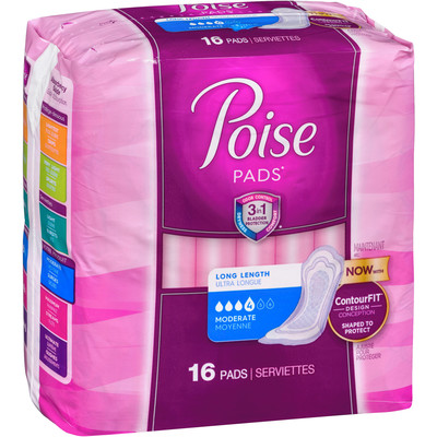 - 16 Poise Incontinence Moderate Absorbency Long Pads—packaging may vary
