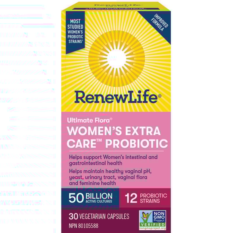 Renew Life Ultimate Flora Women’s Extra Care Probiotic is a specially formulated probiotic designed to support women’s digestive wellness. With 50 billion live cultures from 12 probiotic strains, this probiotic helps maintain healthy vaginal pH, yeast, urinary tract, vaginal flora, and feminine health.