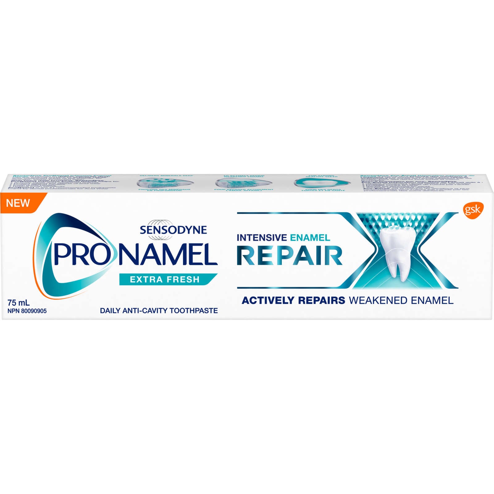 A daily fluoride toothpaste yhat is proven to actively repair acid-weakened tooth enamel. Pronamel intensive enamel repair extra fresh actively repairs acid-weakened tooth enamel, provides cavity protection and protects tooth enamel.always follow the label. Adults and children 12 years of age and over: brush teeth thoroughly (for at least 1 minute), twice daily, preferably after each meal or as directed by a health care practitioner. Spit out and do not swallow. Use no more than 3 times/day. Sensitive teeth may indicate an underlying problem that needs prompt care, if symptoms persist or worsen, stop use and see your dentist.directions: brush with sensodyne pronamel intensive enamel repair extra fresh toothpaste for tooth enamel repair twice a day, minimize swallowing and spit out.medicinal ingredients: potassium nitrate 5% w/w, sodium fluoride 0.254% w/w (0.115% w/w fluoride ion).non- medicinal ingredients: (alpha) cocamidopropyl betaine, flavour, glycerin, hydrated silica, peg-8, pvm/ma copolymer, sodium hydroxide, sodium lactate, sodium saccharin, sorbitol, titanium dioxide, water, xanthan gum.caution: keep out of reach of children. Do not use if allergic to any of the ingredients. Rare symptoms of an allergic reaction may include swelling of the mouth or face. If this occurs, stop use and talk to your dentist or doctor. Not for use by children under 12 years of age. Retain carton for additional information.
