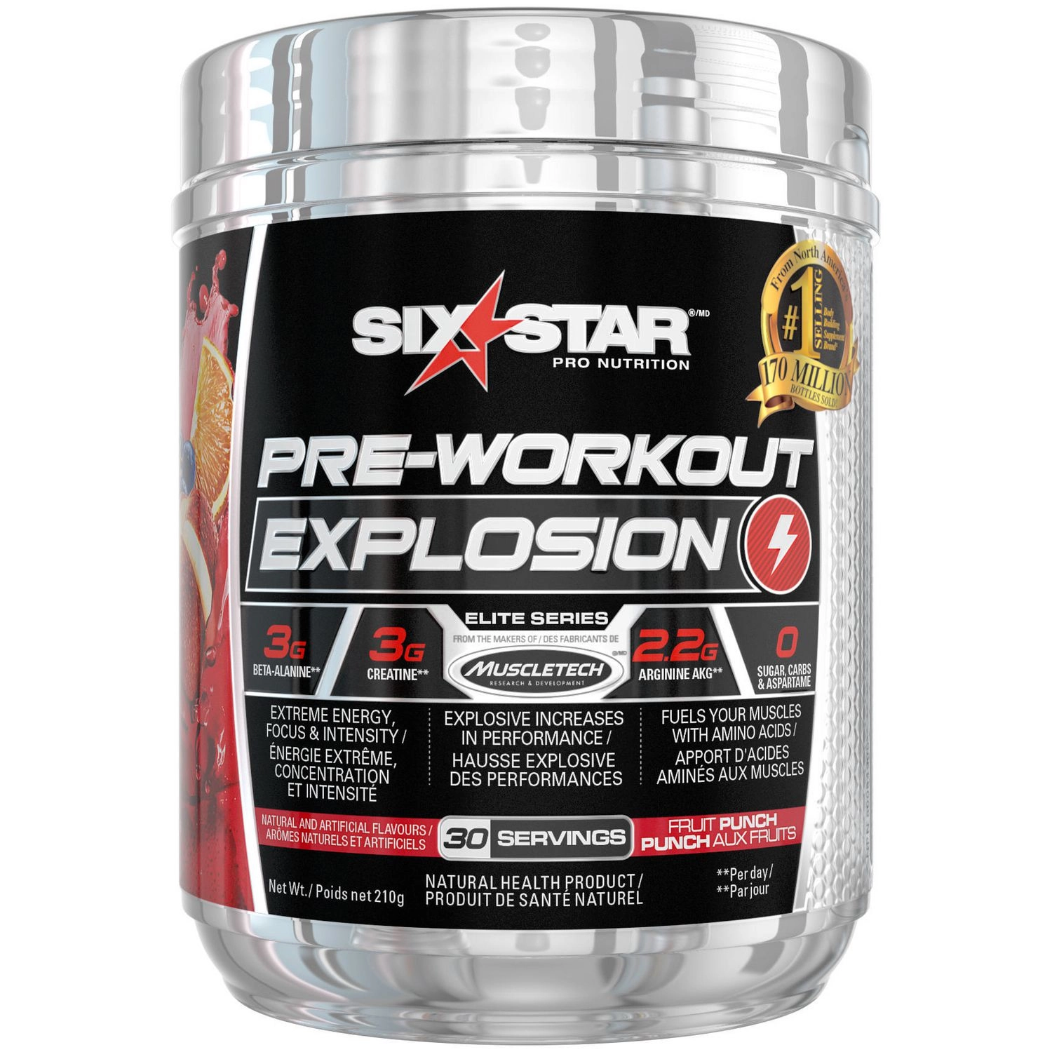 Six Star Pre-Workout Explosion is precisely dosed with arginine AKG, beta-alanine, creatine, and caffeine to provoke peak performance. Loaded with the powerful ingredients beta-alanine, the most studied form of creatine, arginine AKG, and ultra-clean caffeine anhydrous, which work synergistically to increase energy, focus, and intensity, as well as fuel explosive muscle pumps. Take your workouts to new levels with Six Star Explosion, the smartest choice to fuel your hardest workouts and boost your strength and performance. Trust the premium formula from the makers of Muscletech, North America’s #1 selling bodybuilding supplement brand. It’s time to experience the best workout of your life!