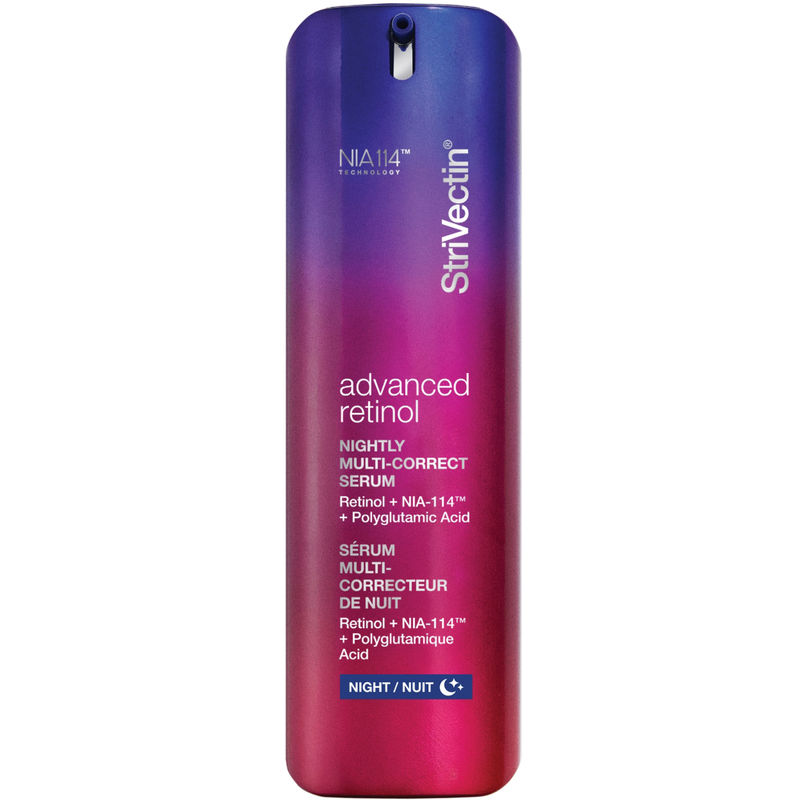 Get smoother, youthful-looking skin with StriVectin Advanced Retinol Nightly Multi-Correct Serum. This ultra-concentrated, potent night serum is expertly engineered for optimized surface release of Retinol to help improve the look of fine lines, wrinkles, skin tone, and texture. Its skin barrier-strengthening NIA-114™ minimizes sensitivity while moisture-binding Polyglutamic Acid helps counteract Retinol’s drying side effects. Calibrated for comfortable delivery of Retinol, this silky, lightweight serum layers easily into any routine.