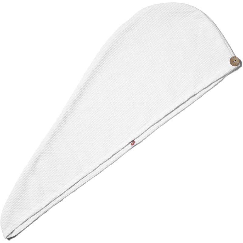 - To secure the towel, wrap the elastic loop around the coconut shell button at the back of your head.