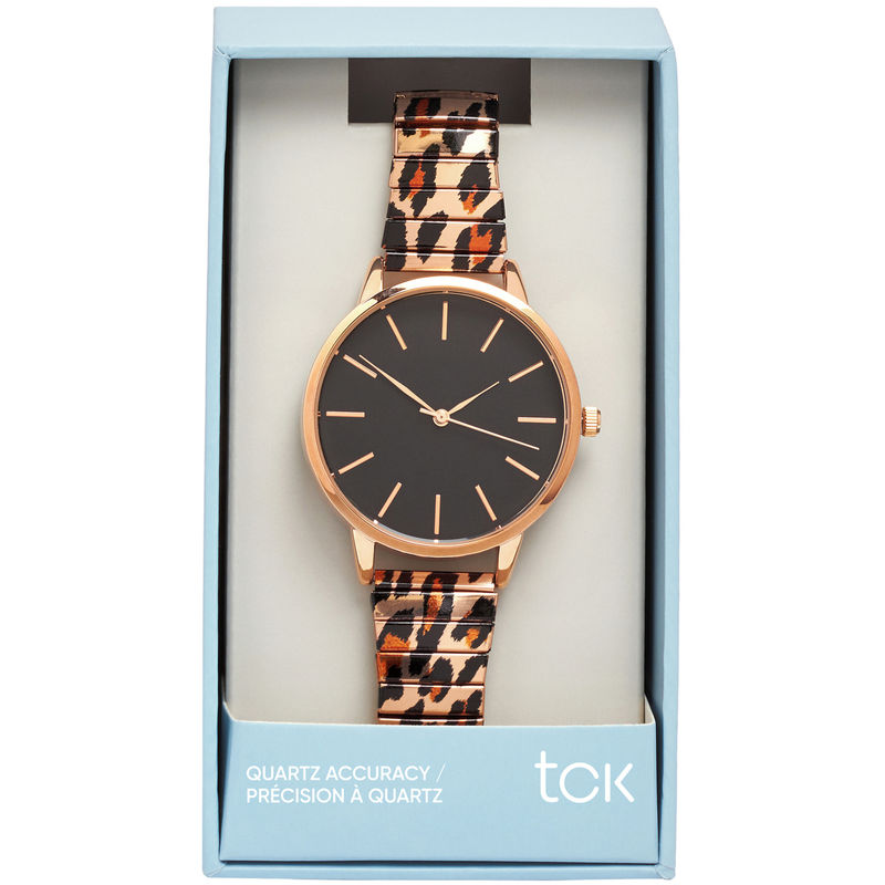 Stay on-trend with the TCK 72 Fashion Watch Ladies. This leopard print watch features an expandable band and a stylish rose gold bezel. Perfect for any fashion-forward woman, this watch is both functional and fashionable.