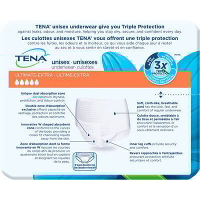 Enjoy sweet dreams with tena overnight underwear with a sleep easy design for superior absorbency and odor control to manage incontinence. Tena® overnight underwear is great for use at night with a secure barrier system and lie-down protection to keep you feeling fresh and dry throughout the night. Experience the triple protection from leaks, odor, and moisture with tena overnight underwear. Product information is provided by the product vendor. This content is a summary for informational purposes only and does not have all possible information about this product. It should not be used as a substitute for advice from health care professionals, as this information alone does not assure that this product is safe, effective, or appropriate for you. For more detailed information on this product, including reported and possible side effects and contraindications, refer to the manufacturer’s monograph, or speak with a health care provider.