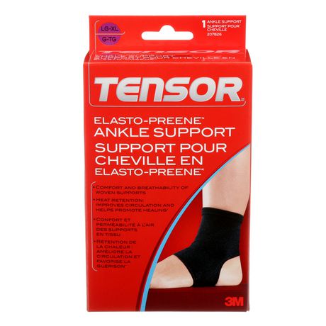 Depend on tensor to help you feel good and perform at your very best during work, life or play!features:provides the desired level of comfort, support, and stabilityinnovative elastic/neoprene blend material around joint creates heat retention to help improve circulation and promote healingprovides compression to help reduce swelling around injured areabreathable fabric releases unwanted moisturecontours to natural bend of ankle to minimize bunching and slippingreinforced edges enhance comfort and durabilityideal for extended wearfits right or left anklesuggested use: general sorenessswellingadditional product view:specifications:adjustable: nobody part: anklecolour: blacklatex free: nosize: large/x-largesupport level: moderatewashable: yesmodel number: 207826.