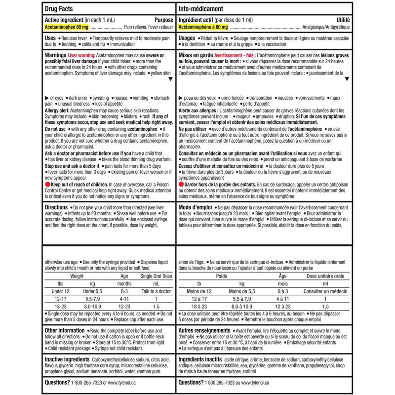 - Medicinal ingredient (each 1 mL contains): Acetaminophen 80 mg