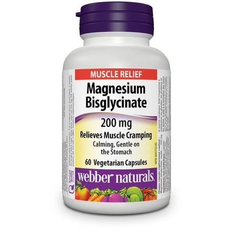Magnesium bisglycinate from webber naturals is a more absorbable form of magnesium that is calming and gentle on the digestive system. As it does not require stomach acidity to be absorbed, it does not cause diarrhea or stomach upset. Magnesium helps maintain proper muscle function and supports healthy bones and teeth, tissue formation, and the metabolism of carbohydrates, proteins, and fats.easier to absorb bisglycinate form of magnesiumgentle on the stomach; does not cause stomach upset or diarrheasupports proper muscle function, including the heart musclehelps in the development of bones and teetheasy-to-swallow vegetarian capsulesdirections: recommended dosage (adults): 1 capsule daily or as directed by a physician.ingredients:each vegetarian capsule contains: magnesium (bisglycinate, oxide) 200 mgfree of artificial colours, preservatives, or sweeteners;no dairy, starch, sugar, wheat, gluten, yeast, soy, corn, egg, fish, shellfish, animalproducts, salt, tree nuts, or gmos. Suitable for vegetarians/vegans. Canadian brandcaution: keep out of reach of children.